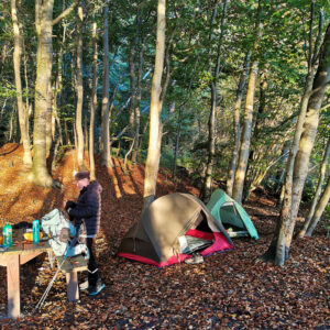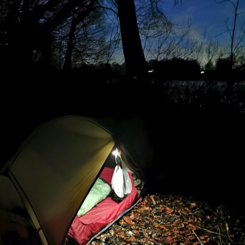Jeg har mit lille yndlingsspot i skovens vestlige hjørne. Der er lige akkurat plads til ét lille telt, og det kan ikke ses fra stien.
