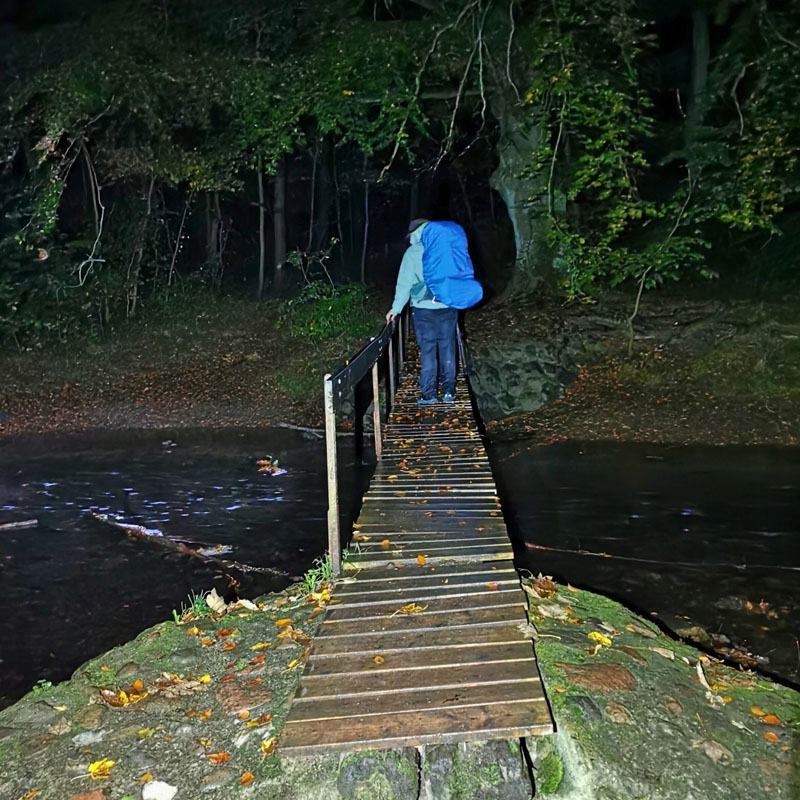 Skoven er smuk i dagslys, men i mørke ændrer den karakter. Stierne bliver sværere at følge, og omgivelserne føles mere intense. Det gjorde turen både en smule nervepirrende og uhyggelig.