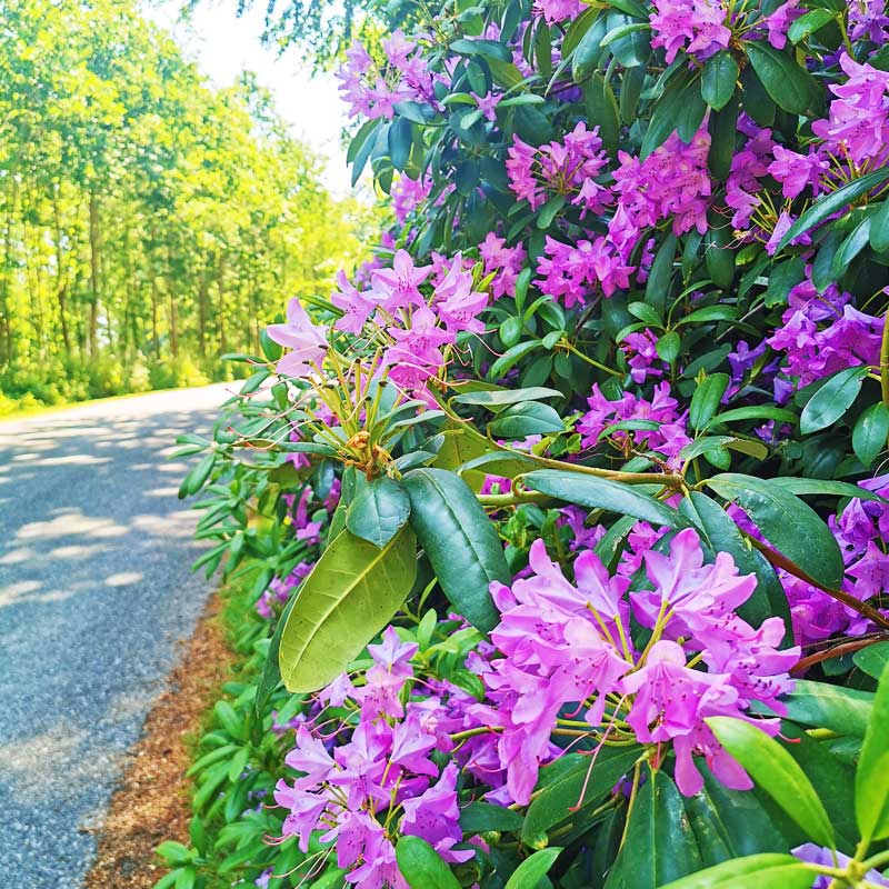 Hvis man går ruten i maj-juni, kommer man forbi en fantastisk strækning i Bøged Skov med store blomstrende rhododendronbuske. Selvom jeg var der sent i blomstringssæsonen, var det stadig et imponerende syn.