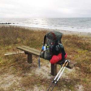 Går man ruten om sommeren, er der flere muligheder for at fylde drikkedunken langs kysten. Det sidste sted på ruten ligger ved Halleby Å, og her skal man sørge for at tanke vand til resten af turen, da der ikke er vand ved lørdagens lejrplads.