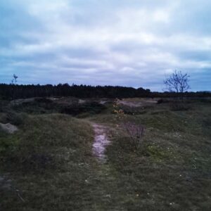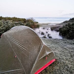 Dette fandt jeg først ud af lørdag, da jeg nåede dertil. Jeg måtte nemlig opgive at finde vej fredag aften. Stien var oversvømmet, og det var umuligt at finde rundt i klitterne på strandengen i mørket. Jeg kunne ikke se anden mulighed end at slå mit telt op der, hvor jeg var nået til.